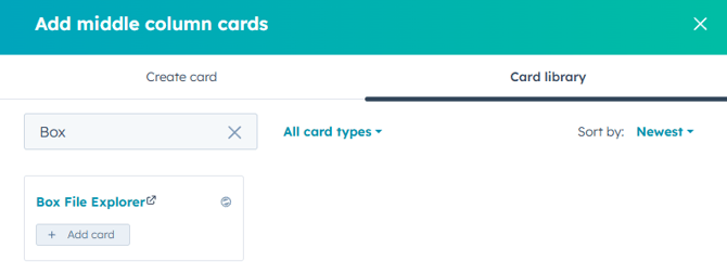 The Box File Explorer CRM Card lets you browse Box files and folders directly inside the middle CRM card in HubSpot. This makes it easier for your team to stay inside HubSpot while still accessing the files they need, without jumping between systems.