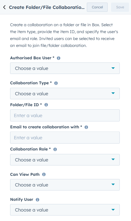 Allows you to create a Box folder or file collaboration/share within a HubSpot workflow