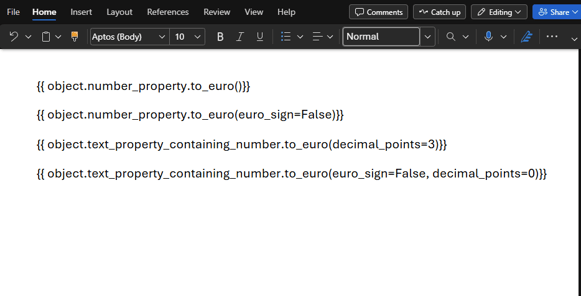 - DocMergy recognises the .to_euro() funtion on the end of a token